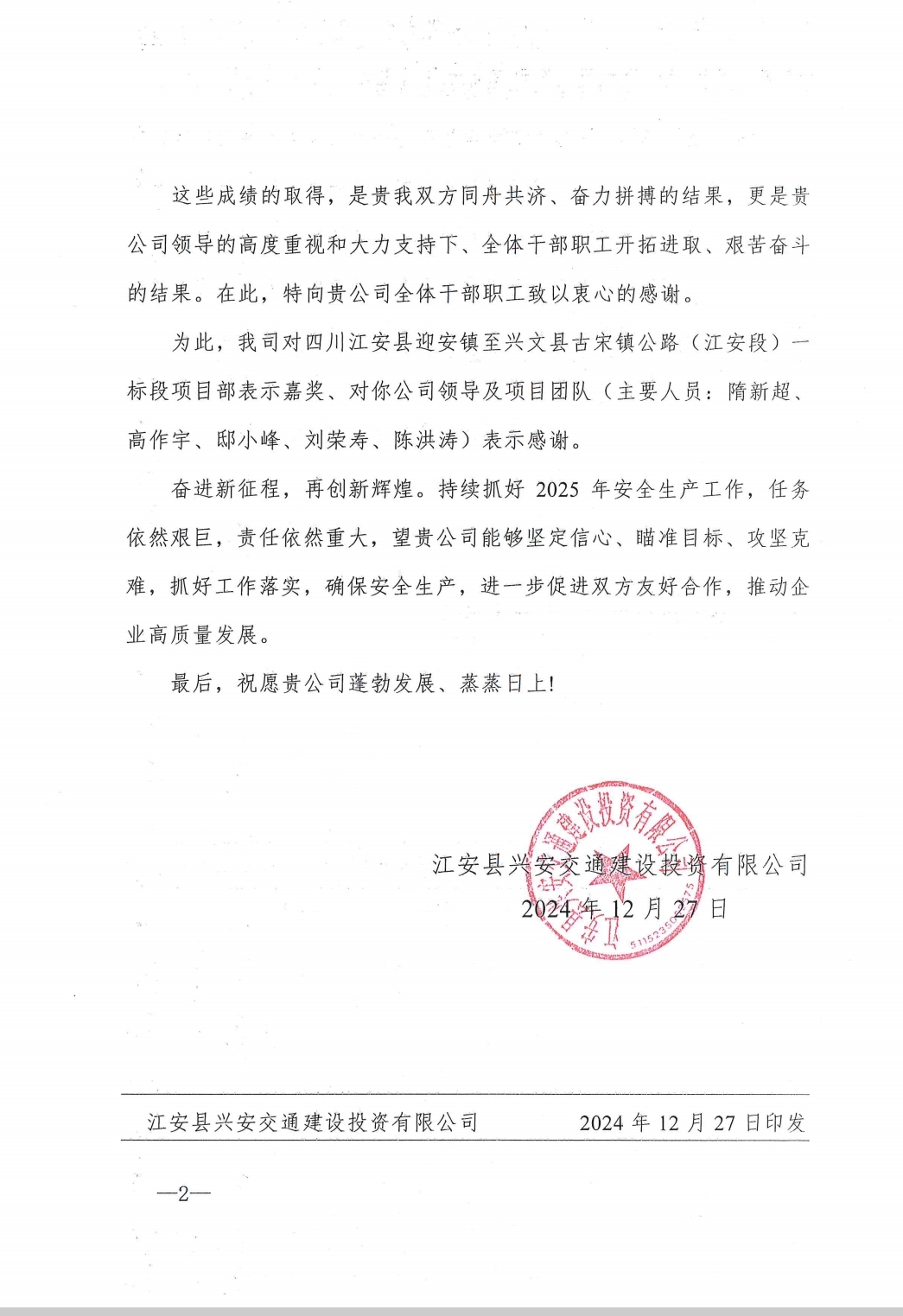 近日,四川分公司江安公路項目部收到江安縣興安交通建設投資有限公司發(fā)來的嘉獎函。