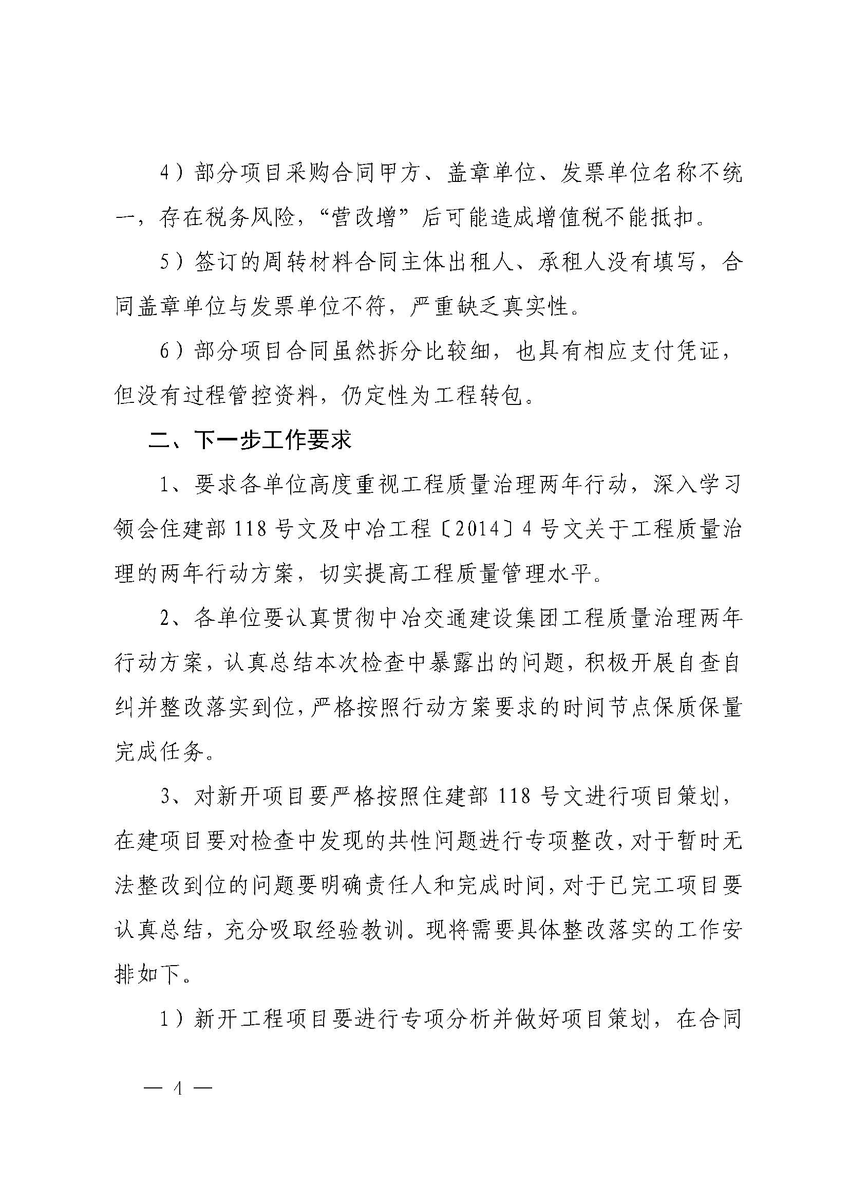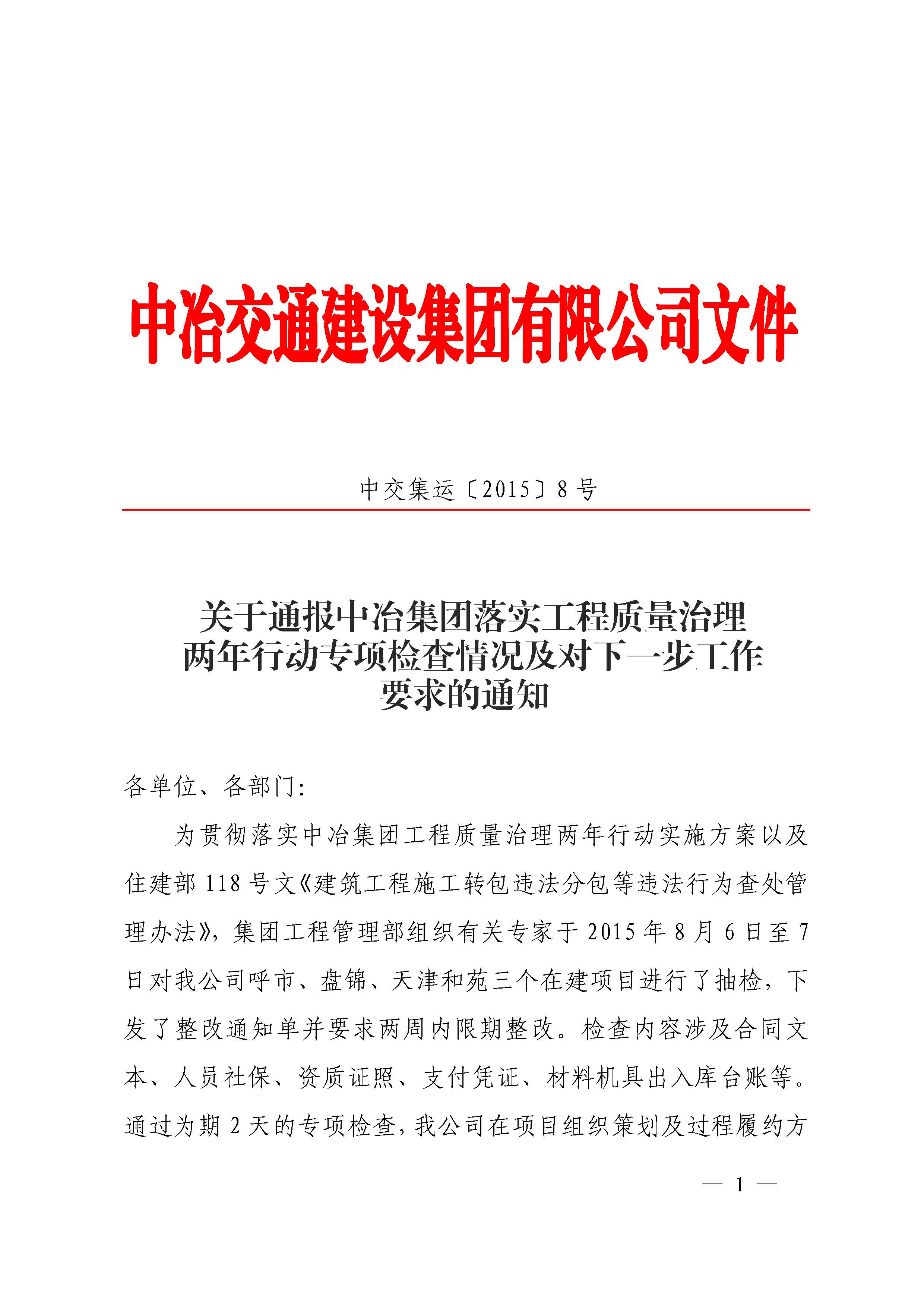 關(guān)于通報中冶集團(tuán)落實(shí)工程質(zhì)量治理兩年行動專項(xiàng)檢查情況及對下一步工作要求的通知